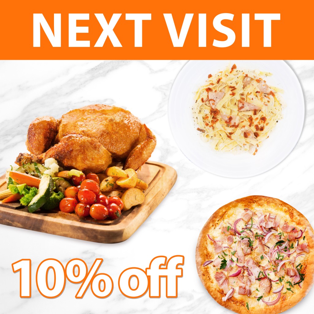 Want to satisfy your whim by trying out all of our mouthwatering dishes? We stand by you! Simply present this receipt on your next visit and enjoy a 10% discount. See you again soon!